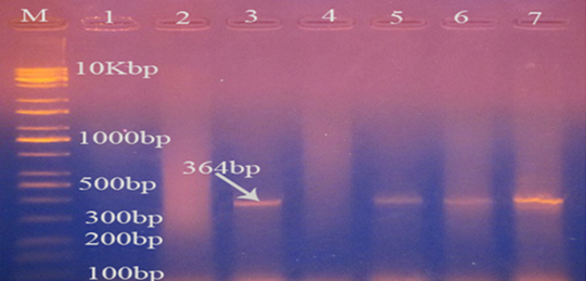 Figure 7: Gel electrophoresis (1% agarose, 7 V/cm for 90 min) for ant(4')-IIb gene for some A. baumannii isolates. Line M 100bp DNA ladder, lines (3,5,6,7) positive results with 364 bp amplicon