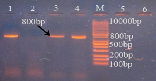 Figure 8: Gel electrophoresis (1% agarose, 7 V/cm for 90 min) for aph(3′)-VI gene for some A. baumannii isolates. Line M 100bp DNA ladder, lines (1, 3,4) positive results with 800bp amplicon