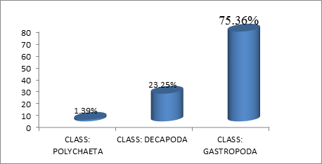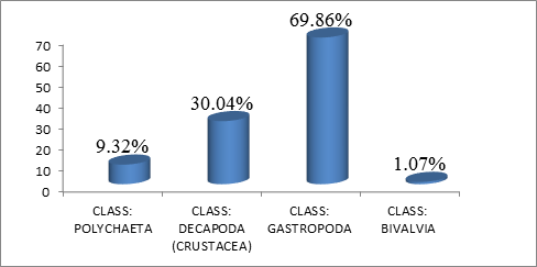 The results also show that the class Gastropoda, made up of 1 family and 2 species had the highest percentage composition (75.36%) and are the most dominant species of the area, followed by the class Decapoda (22.5%), Class Polychaeta (1.39%), and Class Bivalvia (0.57%), respectively (Table 1 and Figure 2). In the baseline study, the percentage composition of the Class Gastropoda was 64.1% (against 75.36% in the current study), followed by the Class Decapoda (Crustacea) which had a percentage composition of 15.37% (against 22.5% in the current study), and then Class Bivalvia which had a percentage composition of 11.99% (against 0.57% in the current study), and Class Polychaeta, which had a percentage composition of 8.55% (against 1.39% in the current study)- figure 3. Various results from studies on benthic macro invertebrates in the Niger Delta showed remarkable variation of dominant groups. According to Woke (2004) organisms of the Classes Gastropoda and Insecta were dominant in his study in terms of species composition and number of families. Conversely, Akani (1994), Mansi (1997), and Zabbey (2002) all reported that the polychaetes were the most dominant benthos. Also, Ewa-Oboho and Oladimej (1999) reported that Polychaetes and crustaceans dominated by species and number (31.2%, 55.6%) and (20.8%, 28.9%), respectively, followed by molluscs (16.9%). In addition, Zabbey (2002) reported that the Class Oligachaeta was the second most dominant benthos in terms of species composition and number of families followed by the Class Crustacea. Snowden and Ekweozor (1990) also reported that the polychaetes and the fiddler crab (Uca tangeri) were the most abundant.