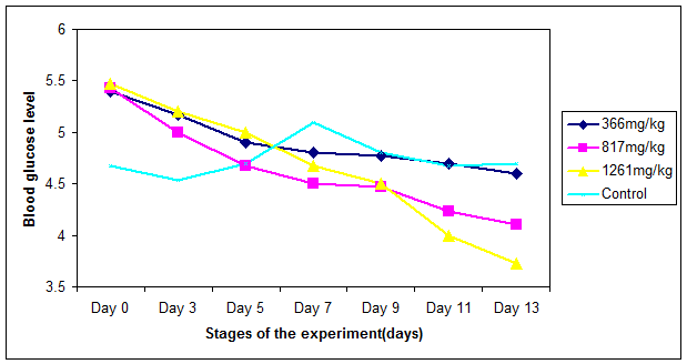 Blood sugar was reduced in group A and B from initial values of 5.40±0.60 to 4.60±0.17 and 5.43±0.59 to 4.10±0.10 in two weeks, i.e. a 14.81% and 24.49% reduction respectively, while that in group C was reduced from 5.47±0.25 to 3.73±0.22mmol/L i.e. a 31.81% reduction. However, the control had a normal rise and fall of blood glucose levels with an initial value of 4.67±0.35, and rose to a peak of 4.80±0.10 on the 9th day and fell to 4.70±0.27 on the final day. With an increase of 0.64% (fig 1) V. amydalina aqueous extract was observed to cause a significant (P< 0.05) reduction in blood glucose level ofnormoglycaemicGuinea pig in all treatment groups as against the control which was not significantly (P 0.05) different from the initial value.