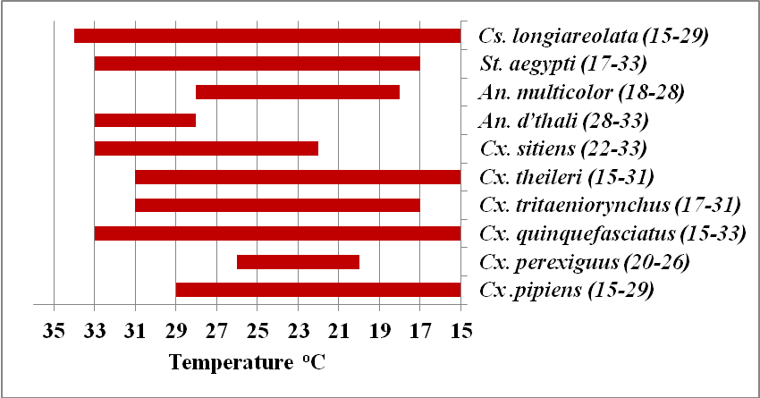 In the present study (Figure 2), Cx. quinquefasciatus (15 to 33 oC), Cx. theileri (15 to 31 oC), Cx .pipiens (15 to 29 oC) and Cs. longiareolata (15 to 29 oC) had wider temperature ranges than those for Cx tritaeniorynchus (17 to 31 oC), St. aegypti (17 to 33 oC), An. multicolor (18 to 28 oC), Cx. perexiguus (20 to 26 oC), Cx. sitiens (22 to 33 oC) and An. d’thali (28 to 33 oC). Cx. torrentium collected only from water had temperature of 26oC. In general, a compiled temperature range of 15 to 33 oC (mean 24.0 oC) was observed for the eleven reported species altogether. More or less similar range of 16.4 to 27.7 oC was found suitable for production and survival of larvae (Culex, Aedes and Anopheles genera) in the Eastern Province, Saudi Arabia and in the summer season, the average temperature in this area became greater than 35 oC which is unsuitable for larval growth (Jemal and Al-Thukair, 2016). Different temperature ranges were reported in several Egyptian Governorates such as 21 to 29 oC (Kenawy et al., 1998), 18 to 30 oC (Abdel-Hamid et al., 2009), 23 to 28 oC (Abdel-Hamid et al., 2011a), 22 to 28 oC (Abdel-Hamid et al., 2011c) and 17 to 30oC (Kenawy et al., 2013). Moreover, WHO (1975) stated that the average optimum temperature for development of most mosquito species is around 25-27°C.