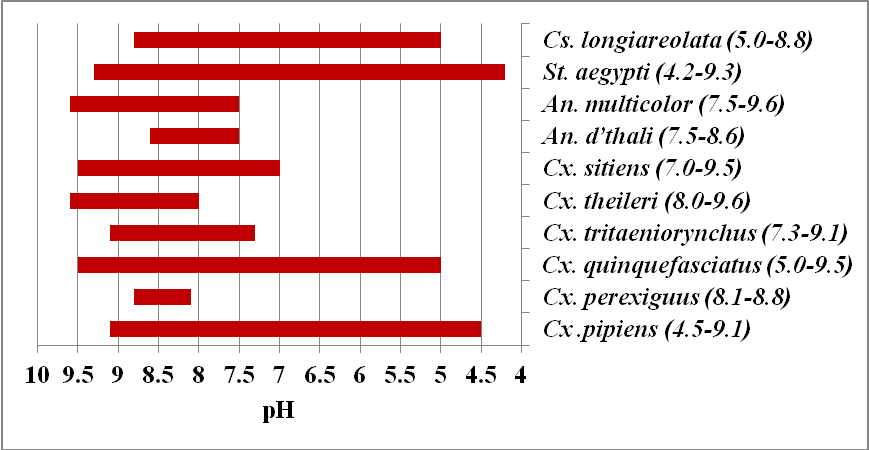 MacGregor (1927) recorded acidophile and alkalinophile mosquito larval species. For the reported species, the observed pH ranges (Figure 3) indicate that St. aegypti (4.2 to 9.3), Cx. pipiens (4.5 to 9.1), Cx. quinquefasciatus (5.0 to 9.5) and Cs. longiareolata (5.0 to 8.8) breed in either acidic or alkaline water (overall range: 4.2 to 9.5 ). The observed acidic to alkaline range is similar to 6.4-9.0 observed by Gad and Salit (1972) in the Red Sea, Egypt and 5.0-8.7 for Cx. pipiens, Cx. perexiguus and Oc. caspius in Cairo (Kenwy et al., 2013). While Cx. sitiens (7.0 to 9.5), Cx. tritaeniorynchus (7.3 to 9.1), An. multicolor (7.5 to 9.6), An. d’thali (7.5 to 8.6), Cx. theileri (8.0 to 9.6) and Cx. perexiguus (8.1 to 8.8) breed entirely in alkaline water (overall range: 7.0 to 9.6). Cx. torrentium collected only from water had pH of 8.5. Although some breeding was observed in acidic water however, most of larval breeding was in alkaline water in agreement with the observations of Kirkpatrick (1925), kenawy and El Said (1990), Kenawy et al. (1998) and Abdel-Hamid et al. (2013) who indicated that mosquito breeding water in several Egyptian Governorates was mostly alkaline (>7).