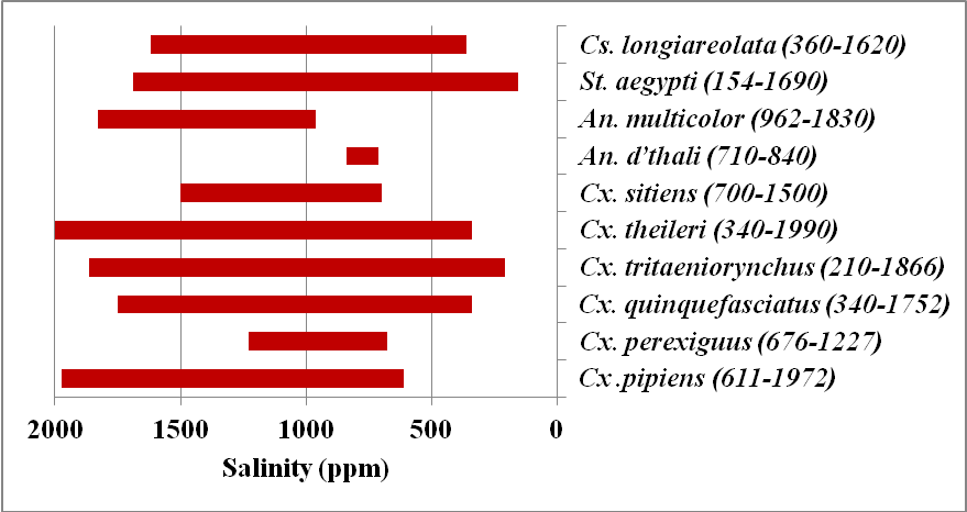 For the breeding water salinity, no available data for Saudi Arabian mosquitoes as do for other countries. Based on water salinity, Kirkpatrick (1925) classified mosquito fauna of Egypt to purely fresh water breeders, purely salt water and more or less indifferent. In the present study, the eleven larval species generally have a salinity range of 154 to 1990 ppm (ca. 0.02 to 0.20%) indicating that these species breed in fresh / brackish water in agreement with the observation of Abdel-Hamid et al. (2011b) for Cx. pipiens and Cx. perexiguus in El-Ismailia and Kenawy et al. (2013) for five species (Cx. pipiens, Cx. perexiguus, Cx. pusillus, Oc. caspius, and Cs. longiareolata) in Cairo, Egypt. The observed salinity ranges for the reported species (Figure 4) indicate that: St. aegypti (154 to 1690 ppm), Cx. tritaeniorynchus (210-1866 ppm), Cx. quinquefasciatus (340 to 1752 ppm), Cx. theileri (340 to 1990 ppm) and Cs. longiareolata (360 to 1620 ppm) had wider ranges than Cx. pipiens (611 to 1972 ppm), Cx. perexiguus (676 to 1227 ppm), Cx. sitiens (700 to 1500 ppm), An. d’thali (710 to 840 ppm), and An. multicolor (962 to 1830 ppm). Cx. torrentium collected only from water had salinity of 907 ppm.