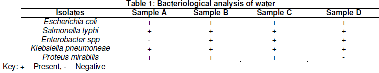 The bacterial isolates recovered from water a sample is presented in Table 1. The result showed that Escherichia coli, Salmonella typhi, Proteus mirabilis, Enterobacter spp and Klebsiella pneumoneae identified. Escherichia coli, Salmonella typhi, and Klebsiella pneumoneae were present in all the water samples