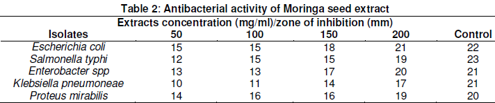 The antibacterial activity of Moringa seed extract against bacterial isolates recovered from the samples is presented in Table 2. Five different faecal coliform bacteria (Escherichia coli, Salmonella typhi, Enterobacter spp, and Klebsiella pneumoneae) were identified. The result showed that the extract is active against the isolates. Antibacterial activity is increasing with the increase in concentration of the extract. The most susceptible isolate is E. coli with average zone of inhibition of 17.82 mm while Klebsiella pneumoneae is the least susceptible with average zone of inhibition of 13.00 mm