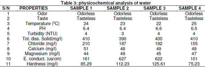 The average physicochemical analysis of the water samples is presented in Table 3. Both physical and chemical properties of water are presented. All of the samples have turbidity of 4NTU except sample 2, which indicated that the samples have high turbidity. The Ph of the water samples ranges from 6.4 - 6.6. Both the water samples were colourless and odourless.