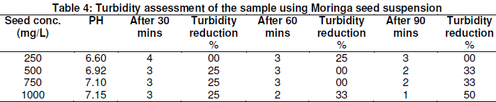 The turbidity assessment after using Moringa seed suspension is presented in Table 4. The result showed that at a concentration of 1000mg/L the Moringa seed suspension can reduce the turbidity of ground water from 4 to 1NTU after exposing for 90 minutes