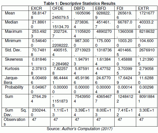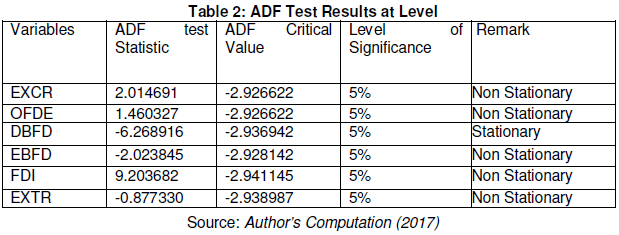 From table 1 above, the standard deviation showed that EBFD (2713923) was the most volatile variable in the series followed by DBFD (1318736), while EXCR (70.74818) was the least volatile variable. The skewness statistic showed that EXCR, DBFD, EBFD, FDI AND EXTR were positively skewed while OFDE variable was negatively skewed. The kurtosis statistic showed that EXCR and EXTR were platykurtic, suggesting that their distributions were flat relative normal distribution while OFDE, DBFD, EBFD and FDI was leptokurtic, suggesting that its distribution was peaked relative normal distribution. Based on these observations, it indicates that the series are non-stationary. However, this indication is not surprising since it involves time series data. In sum, there is unit root (non-stationarity) in the series. In such a case, the presence of unit root in the model is further supported by the values of the Jarque-Bera statistic of most of the variables (OFDE, DBFD, EBFD, FDI and EXTR) in table 1 which are above 5.99 (that is, the Jarque-Bera statistic rejects the null hypothesis of normal distribution for all the variables at 5 percent critical value) depicting the presence of unit root.