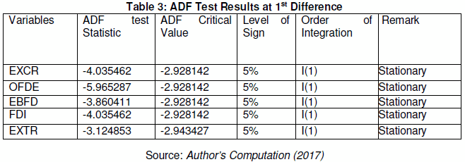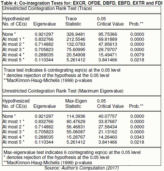 Table 3 revealed that EXCR, OFDE, EBFD, FDI and EXTR were stationary in their first difference. Hence, the study then concluded that the variables of the model are integrated of order one. Having stabilized and stationarized the data, we now conduct the co-integration test.
