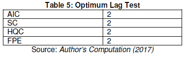 Table 5 shows that lag 2 is chosen as the optimum lag in the specification of VAR model on the relationship between fiscal deficit and macroeconomic performance in Nigeria between 1970 and 2016. Thus, we now estimate and analyze the VAR, impulse response and decomposition of the forecast error variance.