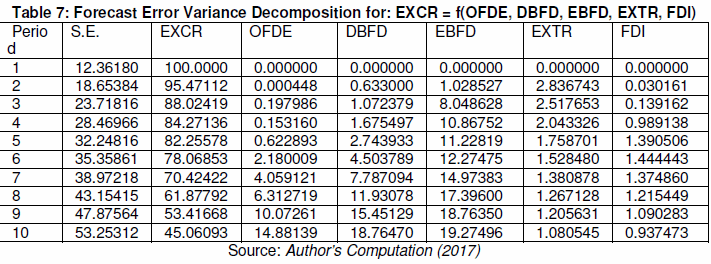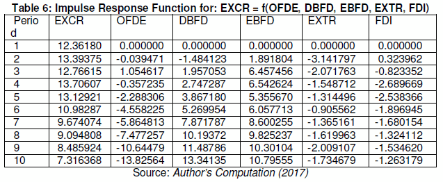 Table 7 (EXCR model) present the results of the variance decomposition for model five. It shows that 100 percent of variance in Exchange Rate (EXCR) in period 1 is explained by the shock from the variable itself. This implies that there was no shock from other variables. In period 2, 95 percent of the variance in Exchange Rate (EXCR) was explained by the shock from the variable itself; 0.0004 percent from fiscal deficit (OFDE); 0.63 percent from the size of fiscal deficit financed by domestic borrowing (DBFD); 1.02 percent from the size of fiscal deficit financed by external borrowing (EBFD); 2.83 percent from External Reserve balance (EXTR) and 0.03 percent from foreign direct investment (FDI).