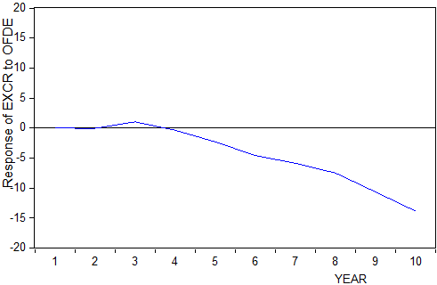 Table 6 (Exchange Rate (EXCR) model) present the results of the impulse response function for exchange rate. From table 6 above, the response of Exchange Rate (EXCR) to one standard innovation in the overall fiscal deficit (OFDE) is all negative at each time responsive period in the long–run except in the 3rd period. This implies that OFDE has a negative relationship with EXCR in the long-run as shown in figure 1 below.