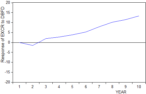 The response of Exchange Rate (EXCR) to one standard innovation in the size of fiscal deficit financed by domestic borrowing (DBFD) is all positive at each time responsive period in the long–run except in the 2nd period. This implies that EXCR has a positive relationship with DBFD in the long-run as shown in figure 3 below.