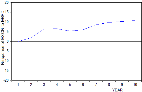 The response of Exchange Rate (EXCR) to one standard innovation in the size of fiscal deficit financed by domestic borrowing (DBFD) is all positive at each time responsive period in the long–run except in the 2nd period while that of the size of fiscal deficit financed by external borrowing (EBFD) is all positive at each time responsive period in the long–run. This implies that EXCR has a positive relationship with DBFD and EBFD in the long-run as shown in the table above.