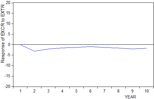 The response of Exchange Rate (EXCR) to one standard innovation in External Reserve Balance (EXTR) is all negative at each time responsive period in the long–run. This implies that EXTR have a negative relationship with EXCR in the long-run as shown in figure 4 below.