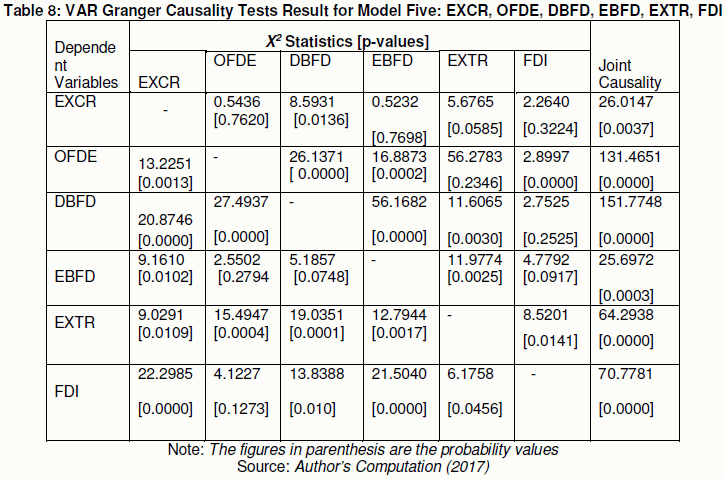 Table 8 above present the VAR granger causality tests result for model five, that is, external sector model. From the result, we found that there is a joint granger causality running from OFDE, DBFD, EBFD, EXTR and FDI to EXCR; there is a joint granger causality running from EXCR, DBFD, EBFD, EXTR and FDI to OFDE and there is also a joint granger causality running from EXCR, OFDE, EBFD, EXTR and FDI to DBFD. Furthermore, the study found that there is a joint granger causality running from EXCR, OFDE, DBFD, EXTR and FDI to EBFD; there is a joint granger causality running from EXCR, OFDE, DBFD, EBFD, and FDI to EXTR and there is also a joint granger causality running from EXCR, OFDE, DBFD, EBFD, and EXTR to FDI.