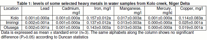 Table 1 presents the heavy metal concentration in water samples from Kolo creek. The values ranged from 0.001 – 0.002 mg/l, 0.001 – 0.001 mg/l, 0.137 – 0.157 mg/l, 0.013 – 0.017 mg/l, 0.000 – 0.001 mg/l and 0.019 – 0.114 mg/l for lead, cadmium, iron, manganese, mercury and copper respectively. There was no significance variation (P>0.05) among the levels of heavy metals in the water samples from the various sampling stations (Kolo, Imiringi and Otusega). Absence of variation suggests that difference in anthropogenic activities going on in the creek at various points (study location) do not alter the heavy metal concentration in the water. The concentration of heavy metals in the water is below the level specific for drinking water by Standard Organization of Nigeria (Nigeria drinking water guideline) SON (2007) and World Health Organization (2011). Again, this suggests that there is no heavy metal pollution in the creek.
