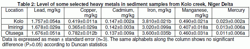 The levels of some selected heavy metals in sediment samples from Kolo creek, Niger Delta are presented in Table 2. The concentration of lead, copper, cadmium, iron, manganese and mercury ranged from 1.676 – 1.757 mg/kg, 0.365 – 0.782 mg/kg, 0.137 – 0.147 mg/kg, 3.020 – 3.810 mg/kg, 0.407 – 0.490 mg/kg and 0.011 – 0.023 mg/kg for lead, copper, cadmium, iron, manganese and mercury respectively. Besides copper and iron, there was no significant difference (P>0.05) among the various locations for each parameter. Furthermore, apart from samples from Otusega for copper concentration and Imiringi for iron level, there was no significant difference (P>0.05) between the locations for copper and iron. Absence of significant variation in most of the heavy metals suggest activities leading to heavy metals in soil which deposits in the water sediment is typically the same at the various locations. The occurrence of heavy metals in the sediment far above the concentration in the water suggests the ability of materials including decomposing plants and animals and constituents of various wastes stream to accumulate at the sediment. The occurrence of heavy metals in the environment is typically from several anthropogenic activities resulting from urbanization, industrialization and geologic processes (Butu and Iguisi, 2013; Izah et al., 2016).
