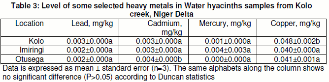 The levels of some heavy metals in tissue of Eichhornia crassipes from Kolo creek are presented in Table 3. The heavy metal concentration ranged from 0.002 – 0.003 mg/kg, 0.003 – 0.004 mg/kg, 0.000 – 0.004 mg/kg and 0.040 – 0.048 mg/kg for lead, cadmium, mercury and copper respectively. Lack of significant variations among the various locations suggested that the level of heavy metal in the tissues of Eichhornia crassipes from Kolo creek is an indication of similarity in the activities leading to heavy metals in the surface water around the study area. The concentration of heavy metals in the tissues of Eichhornia crassipes was very low. This suggests no significant bioaccumulation of heavy metals in the Eichhornia crassipes in the study area. The low concentration could be due to low concentration of heavy metals in the water samples.