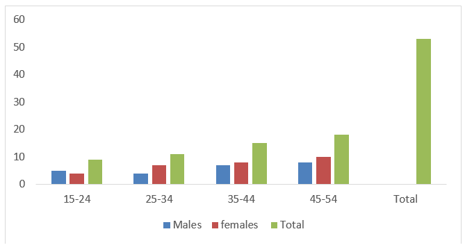 A total of fifty-three (53) isolates were obtained from the three hundred and seventy eight (378) sputum samples examined. Chi square analysis showed no significant association between the sexes and the occurrence of isolates. Females accounted for 29(54.7%) isolates while males had 24(45.2%). The difference was not statistically significant (X2 = 0.47, df = 1, p≥ 0.05). Age group 45-54 had the highest isolation of Pseudomonas aeruginosa with a total of 18(33.96%), followed by age group 35-44, 15(28.30%) as shown in Figure 1.