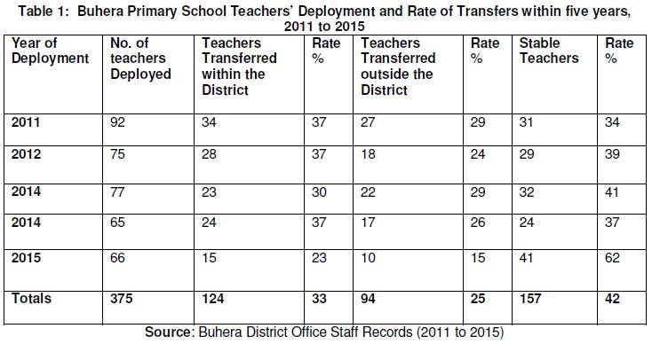 Zvobgo (1986) comments that qualified teachers are always a solution to high quality education. Therefore the quality of education at any school is very much dependent on the quality of the teachers in the school system. However, at some schools throughout the country, qualified teachers are never stable. They come and go through transfers to other schools. Buhera District has not been spared on this problem. While equity and equality have been used by government to efficiently deploy teachers to all the provinces and eventually to all the districts, there has been continuous movement of qualified teachers from one school to the other, one district to the next, and even from one province to another. For the past five years, Buhera District has been seriously affected by high teacher turnover. From 2011 to 2015 it has been established that 375 newly qualified teachers from colleges were deployed to Buhera District primary schools to take up vacant posts which were temporarily occupied by untrained teachers. Since then, 218 of them which are 58% have transferred from their original schools to other schools within or outside this district. The table of teachers’ transfers below is an extract produced from the District Education Officers’ records at Buhera Education Offices.