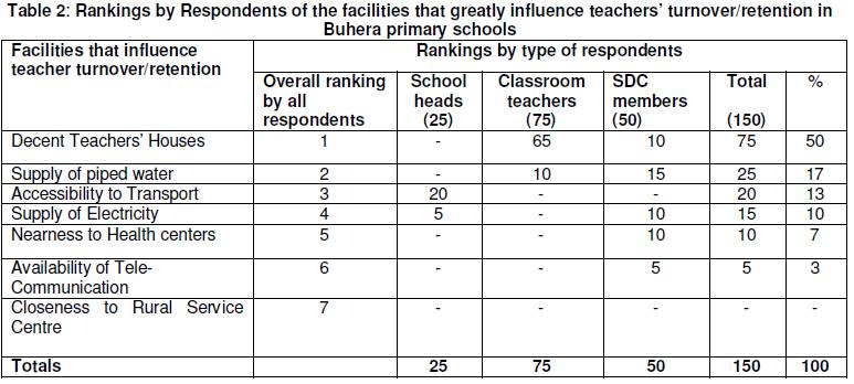 From the collected data reflected in table 5 and interviews carried out with respondents, School Development Committees should not only construct school structures but the structures need to be attractive enough to lure suitably qualified teachers. Hystek and Louw. (2009) stresses that provisions given to schools should always be in good repair to make them useful. In table 4, the need for adequate decent teacher’s accommodation was ranked the top most in influencing teacher turnover. That does not mean simple houses with walls and roofs on. A decent accommodation should provide the comfort which the occupant likes. As a result, School Development Committees have to ensure that the structures that exist in their schools are comfortable enough. From Table 2 above, respondents showed items like electricity, piped water and telephones as essential for a teacher’s life. Such items and others should therefore be included on existing teachers’ houses to make them decent enough.