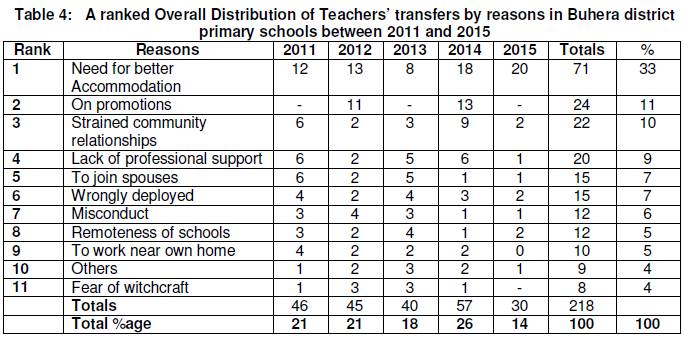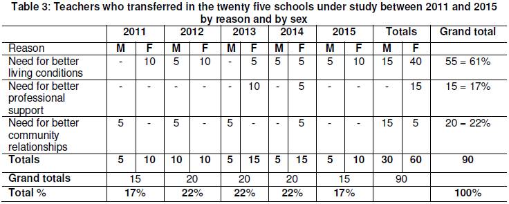 The researchers further carried out a documentary analysis of transfer records at the schools and at the District Education Office of the Ministry of Primary and Secondary Education to capture information on the reasons for teachers’ transfers over the past five years, 2011 to 2015. The documentary analysis was extremely valuable in this study because the teachers, who transferred from the schools under study, moved to places which were difficult and expensive to reach and yet their information was very valid for this study.