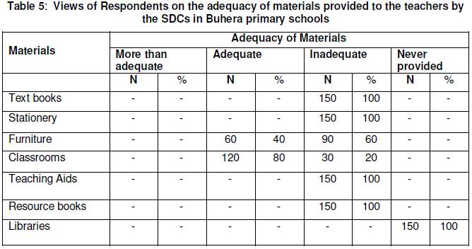 An interview with the teachers, school heads and SDCs revealed that teachers could always afford to improvise minor teaching or learning aids like painting brushes, charts and those which are cheap. Big items like videos, furniture or text books would need to be strictly catered for by the school budget each year. School budgets are always the business of the SDC finance committee. Therefore it stands to reason that all cases of non - provision and inadequate provision of teachers’ support materials should be the obligation of the School Development Committees. The ability by SDCs to provide their teachers with appropriate professional support would lead to long stay of teachers in schools which would result in the provision of high quality education to the learners.