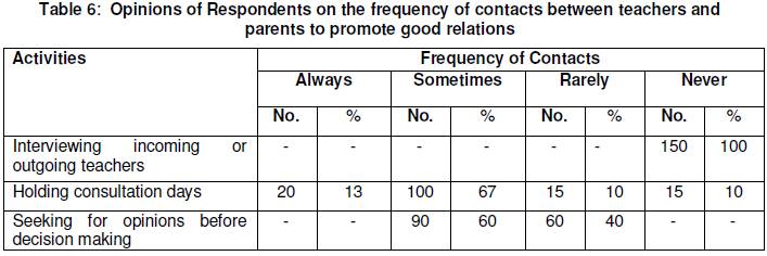 Table 6 shows that SDCs never conducted interviews with their incoming or outgoing teachers, because of that, the SDCs may never know teachers’ needs as they get into their schools or the reasons that make them choose to leave. In the same table, 67% of the participants indicated that SDCs sometimes contact their teachers for decision making. However there were varied opinions on the holding of consultation days which ranked from never, rarely, sometimes, up to always conducted. When a healthy community relationship is established at a school, teachers and parents will understand one another thereby promoting teamwork which would allow effective goal achievement at the school.