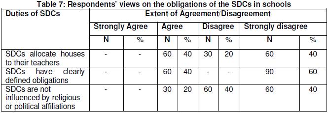 It was also interesting to investigate on the responsibilities SDCs have in running the affairs of their schools in terms of the rules, policies and regulations that govern their obligations. For the schools under study, table 7 shows that only 40% of the participants agreed that the allocation of teachers’ houses was done by SDCs while the other 60% disagreed to that. Such a situation is usually a source of conflict when members of the SDCs do what they should not do or fail to do what they should do. In table 7, a small proportion of the respondents (20%) agreed that SDCs were not influenced by religious or political emotions in their operations of school development. Such a scenario is very detrimental to teaching and learning in schools because the pupils who are the key beneficiaries of the schools come from varied parents in terms of religion or party politics and should receive appropriate services in their schools. Chikwature and Oyedele (2016) acknowledge that where people’s usual business is confused with party politics, then most of the time and effort of the management are directed towards addressing political issues or interests at the expense of real business. For example in schools if SDCs use schools as campaign fields for party politics then school development would suffer. From the above discussion, SDCs should therefore develop in them skills that would always make them capable of referring to the rules and regulations that govern their obligations like statutory instruments. They all need to be apolitical and impartial when executing their duties. An interview of the SDCs was made to establish if they were conversant with the contents of the statutory instrument 87 of 1992 about 90% of the respondents were ignorant about its existence. However they were aware of some of the requirements of the instrument. That showed that SDCs had no full exposure of the document but were briefed in bits and pieces. For SDCs to be able to carry out their obligations, it is indeed imperative that they are conversant with the contents of Statutory Instruments which spell out their obligations.