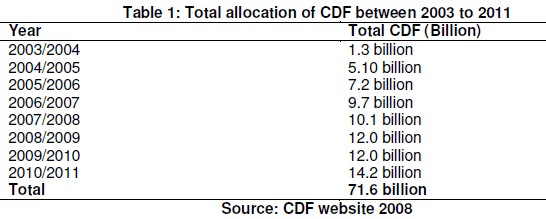 Murage, M. P. (2008).Contribution of CDF to Secondary Education in Laikipia West District. Kenya. Unpublished Masters Thesis.Maseno University.