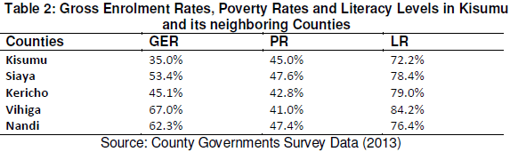 Kisumu County was specifically chosen for this study for reasons that its statistics depict rather lower standards in terms of access to secondary education. For instance the Gross Enrolment Rate for Kisumu County was 35.0% while that for Siaya was 53.4%, Kericho was 45.1%, Vihiga was 67.0% and Nandi was 62.3%. This is further confirmed by the literacy rates which are higher in other counties neighboring Kisumu County. Vihiga County has a literacy rate of 84.2% followed by Kericho County (79.0%), Siaya County (78.4%) and Nandi County (76.4%). Kisumu County has the lowest literacy rate which is 72.2%. At a rate of 45.0% Kisumu County’s poverty rate is only higher than that of Kericho County which is 42.8% and Vihiga which is 41.0%. The rest of the neighboring counties namely Siaya (47.6%) and Nandi (47.4%) have higher poverty rates yet they are doing better than Kisumu County in terms of enrolment. It would have been normal if their enrolments depicted low standards given the high rates of poverty seen in their counties since one of the major hindrances to students’ access to secondary education are to do with poverty levels of their parents. CDF is allocated equally to the existing constituencies and a small percentage is allocated to the constituencies according to their poverty rates. Since Kisumu County has been one of the beneficiaries of CDF there is no justification for its low enrolment compared to the neighboring counties because it would be argued that it receives more money from CDF than Siaya and Nandi Counties who’s GER is much higher. This therefore justified that an investigation needed to be carried out in Kisumu County to establish if CDF has any influence on access to secondary education in public schools.