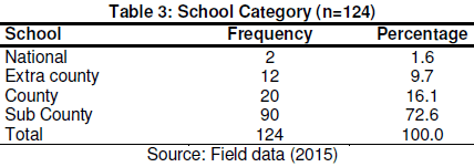 The study sought to establish the various categories of schools whose students were involved in the study. School category was believed to be an important aspect in exploring the influence of CDF on access to secondary education in public schools. This information was given by124 Principals who participated in the study. The findings are presented on Table 3.