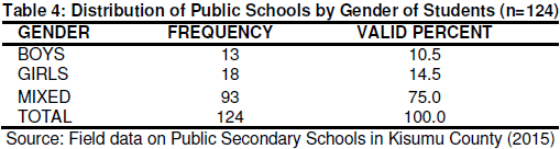 The principal respondents were asked to classify their schools according to the gender of students. The study sought this information because it was considered important in regards to access to education in public schools in Kisumu County. This information was presented in Table 4.