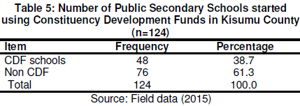 The findings on Table 5 showed that CDF, as a devolved fund had helped to start a reasonable number of public secondary schools within Kisumu County and in fact they were referred to as CDF schools. This was reflected by more than a third 48(38.7%) of the principals in Kisumu County who took part in the study and indicated that the secondary schools which they headed were indeed started using CDF funding. The table further revealed that the rest of the schools 76(61.3%) in the county, had been in existence before CDF was created. These findings imply that CDF programme in Kisumu County has significantly reached the locals and this has given young people the opportunity to access secondary education.