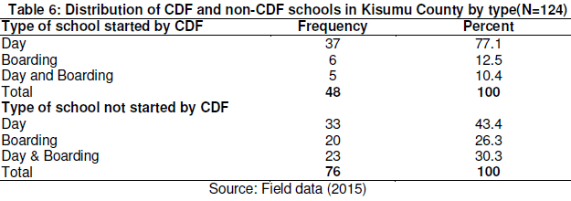 The study sought to establish the number of CDF and non- CDF schools in the county by type. This information was concurrently presented on Table 6.