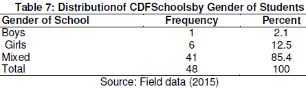 The study sought to establish the number of CDF secondary schools by gender of students. This information was presented in Table 7.