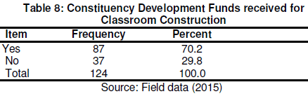 The findings from Table 8 revealed that majority of the schools 87(70.2%) received money from CDF to construct new classrooms. Only 37(29.8%) schools did not receive the funds. To verify the information of classroom funding by CDF, the study sought to find out from the students during Focus Group Discussion whether there were new classrooms constructed using CDF in their schools. Majority of them concurred with the Principals on CDF involvement in classroom construction while some said they were not aware. During Focus Group Discussions, one student stated that: “We have seen new classrooms being constructed and the inscription reads…this classroom was constructed using CDF funds. The new classroom has really helped us because we were learning under a tree and that was not comfortable for us especially during rainy seasons or when the sun was too hot”. This implies that CDF funding has actually assisted in constructing classrooms in public schools in Kisumu County. However, the fact that 70.2% of the Principals agreed that their schools had received some money towards classroom construction even though some students stated otherwise during Focused Group Discussions did not mean that there was any significant disparity in their responses. This could imply that construction process takes a long time to be completed hence creating the gap of received funds and the completed project. The red tape and bureaucratic system associated with the government procurement and spending procedures could derail the process hence creating lack of harmony between the amount of money already received and the finished work; the students could therefore only be able to see the classrooms labeled as CDF project once they were completed but not before.