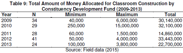 The findings show that the year 2012 had the highest amount of money allocated for classroom projects. In that year alone a total of Ksh. 33,443,000/= was spent in classroom projects in 41 secondary schools. On the other hand, the year 2011 received the least amount of money for classroom projects; only Ksh.14, 860, 000 was allocated for construction of classrooms in 28 secondary schools from sampled schools within the county in that year.