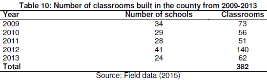 The study sought to establish the actual number of classrooms built by CDF in public schools in the county from 2009-2013. The findings were presented in Table 10.