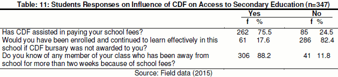 The study sought to investigate the influence of CDF on access to secondary education as was perceived by the student respondents. The items or questions asked to the students who participated in the study were related to the constructs that sought their opinion on the influence of CDF on access to secondary education. Their responses were presented in Table 11.