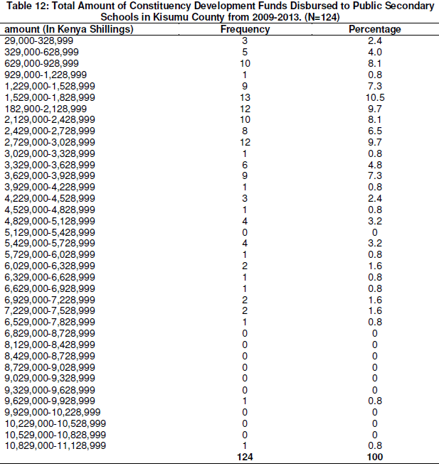 Table 12 shows the total amount of CDF money disbursed to public secondary schools between the years 2008-2013. From the table it can be argued that majority of schools 13(10.5%) received between Ksh 1,529,000 - 1,828,999 in a period of five years. It can also be seen that 12(9.7%) schools received between Ksh. 1,829,000-2,128,999 while a similar number 12(9.7%) received between Ksh. 2,729,000-3,028,999. The schools that received above 3.6 million were only 9(7.3) %. About 83(66.9%) received less than Ksh. 3,000,000 when the range was between Ksh. 29,000-11,000,000. For a period of five years, this may not add much space which can accommodate more students in public secondary schools as it should. The schools which received above Ksh. 5,000,000 were only 5(4.0%) with another 4(3.2%) receiving between Ksh. 6,029,000 and Ksh. 6,928,999. A few schools, 3(2.4%) received between Ksh.7, 229,000 and Ksh. 7,828,999. Only 1(0.8%) school managed to receive above Ksh. 9,300,000. The highest amount of money received during that period was Ksh. 11,128,999 and this was only received by 1(0.8%) school. The findings from Table 12 therefore indicate that in as much as the range of the amount received by schools from CDF was between Ksh. 29,000 and K.sh 11,000,000, it was only 1(0.8%) school which received that highest amount with a total population enrolment of 720 students in five years. This did not attract as many children as it should have. These findings further confirm that the enrolment could have been influenced by other factors such as Free Secondary School which was not part of this study, and not CDF. These findings concur with those of correlation analysis in this study which gave a weak correlation between CDF and access to secondary education in public schools in the county.
