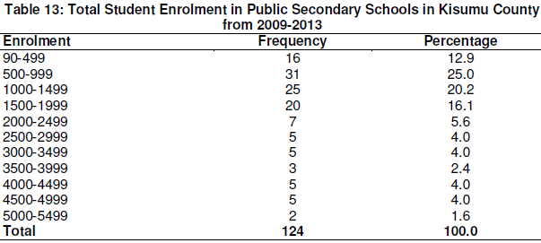 Table 13 shows the total enrolment in Public Secondary Schools in Kisumu County between the years 2009-2013. The table shows that 31(25.0%) of the schools had a total enrolment between 500-999, followed by 25(20.2%) schools with a total enrolment falling between 1000-1499. A good number of schools 20(16.1%) had a total enrolment ranging from 1500 to 1999 students. The schools which had a total enrolment of above 3000 students were only 5(4.0%) with 3(2.4%) having an enrolment of between 3500 and 3999 students. Another 5(4.0%) had a total enrolment of between 4500 and 4999 students. The least number of schools 2(1.6%) had a total enrolment of between 5000 and 5499 for the period under study.