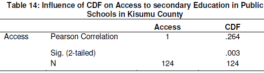 In order to address this objective, a null hypothesis was generated “There is no significant relationship between CDF and Access to Secondary Education in Public Schools in Kisumu County”. In response to this hypothesis data was collected on all the monies received from CDF by 124 public secondary schools in Kisumu County and their enrolment between 2009 and 2013. The data on enrolment and CDF funds were therefore computed in order to get the correlation between the two variables. The results are presented in Table 14.