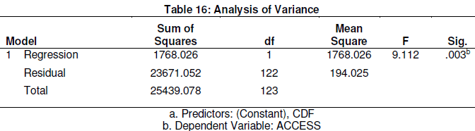 To establish whether CDF was a significant predictor of access to secondary education, ANOVA was computed and the results were as shown in Table 16.