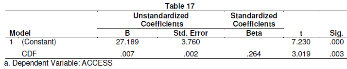 From Table 16, it can be observed that the calculated p-value is 0.003 which is less than the set p value of 0.05. This therefore means that CDF is a significant predictor of access to secondary education in public schools in Kisumu County. (F (1,122) =9.112, p=.05. Linear regression was computed to confirm the actual influence and the results were as shown in Table 17.