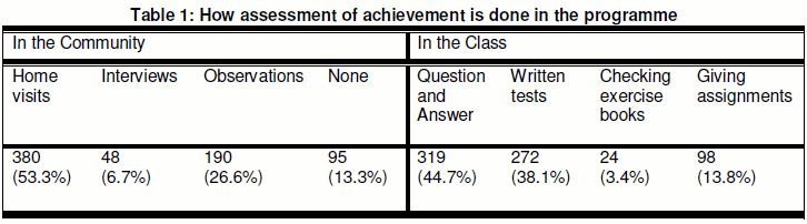 In the class, the most dominant methods of assessment were found to be oral question and answer (44.7%) and giving written tests (38.1%). These were also important in assessing the extent to which the learners had acquired the theoretical understanding of the subject matter before going to the field to apply the acquired knowledge and skills in everyday life. That assessment that was also done downstream at the community level showed that evaluation was being properly done, as that is where action is, and the effects of the programme, as it impacted, could be seen. The assessments done in the class and those done downstream in the community were therefore aimed at testing different things. While the assessments done in class were aimed at ascertaining the level of theoretical understanding of the subject matter, those done downstream in the community were aimed at confirming the extent to which the acquired knowledge and skills were used in everyday life to solve contemporary problems in society such as attempting to develop and manage the environment.