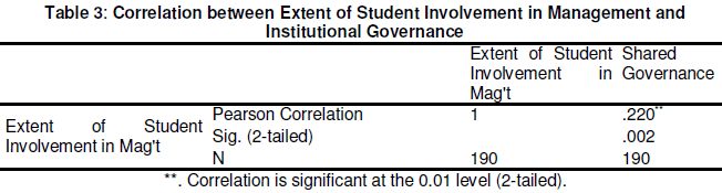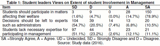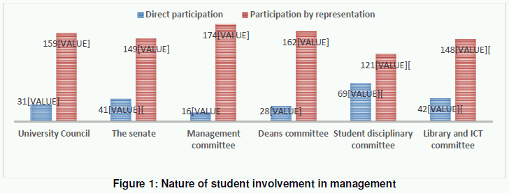 The study sought to investigate the extent of student involvement in management and its influence on institutional governance. This objective was addressed by exploring the nature of students’ involvement in management in the university and its influence in management on institutional governance.
