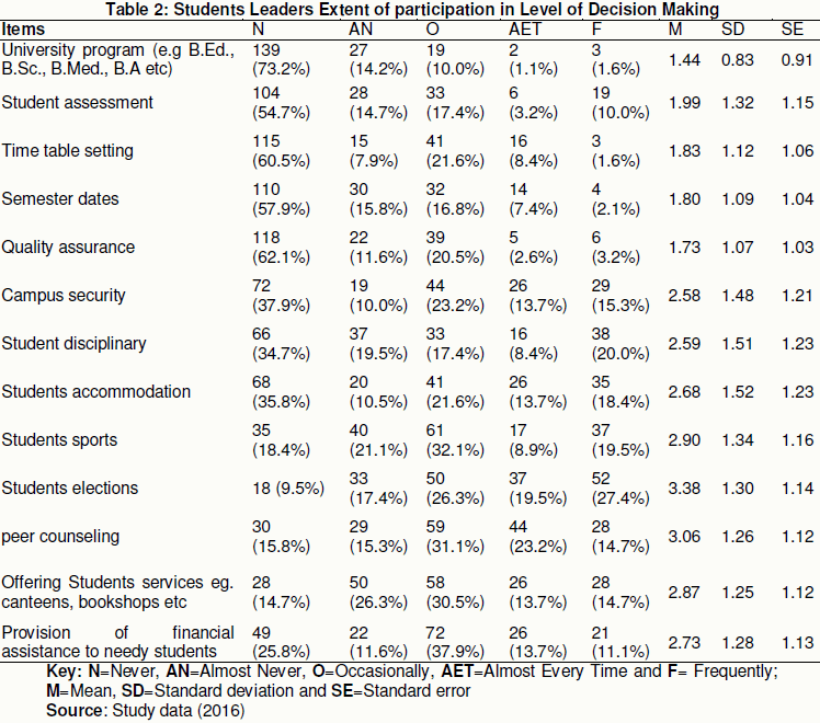 The results of the study confirm that although university management try to embrace the idea of shared decision making by sharing responsibilities and having joint effort in decision making by all major stake holders including students through their leaders, this has not been fully achieved, as reflected by the findings of this study. The university management still dominates many areas with quite a minimal level of students’ involvement. For instance, at the levels of university programs (e.g. B.Ed., B.Sc., B.Med., B.A etc.), student assessments, quality assurance and semester dates, university management enjoy overwhelming authority to make decisions. Only 5 (2.7%) of the students leaders said they are involved in making decisions concerning university programs, 25 (13.2%) of them participate in student assessments committees, 11 (5.8%) of them are involved in quality assurance decisions and only 18 (9.5%) of the student leaders observed that they are often involved in making decisions on semester dates. Similarly, contrary to the generally held opinion that university students, through their representatives, are always involved in timetabling committees, the findings of the study reveal that significant majority of 115 (60.5%) of the student leaders who took part in this study said they are never involved in time table setting. In fact, of the few [41 (21.6%)] who agree that they get involved in the time table setting process said they are only involved occasionally. Those who alluded that they are always involved in timetabling committee formed a near negligible proportion [3 (1.6%)] of the student leaders who took part in the study.