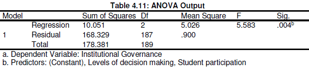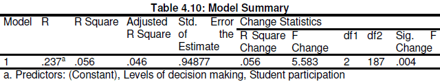 In the Model Summary (Table 4.10), the value of R Square (.056) indicates how much of the variance in the dependent variable (institutional governance) was explained by the two variables: levels of decision making and student participation. This value expressed as a percentage means that the model explains 5.6 percentage of the variance in scores of shared governance. To assess the statistical significance of the result, the ANOVA output shown in Table 4.11 was used to tests the null hypothesis that multiple R in the population equals 0.